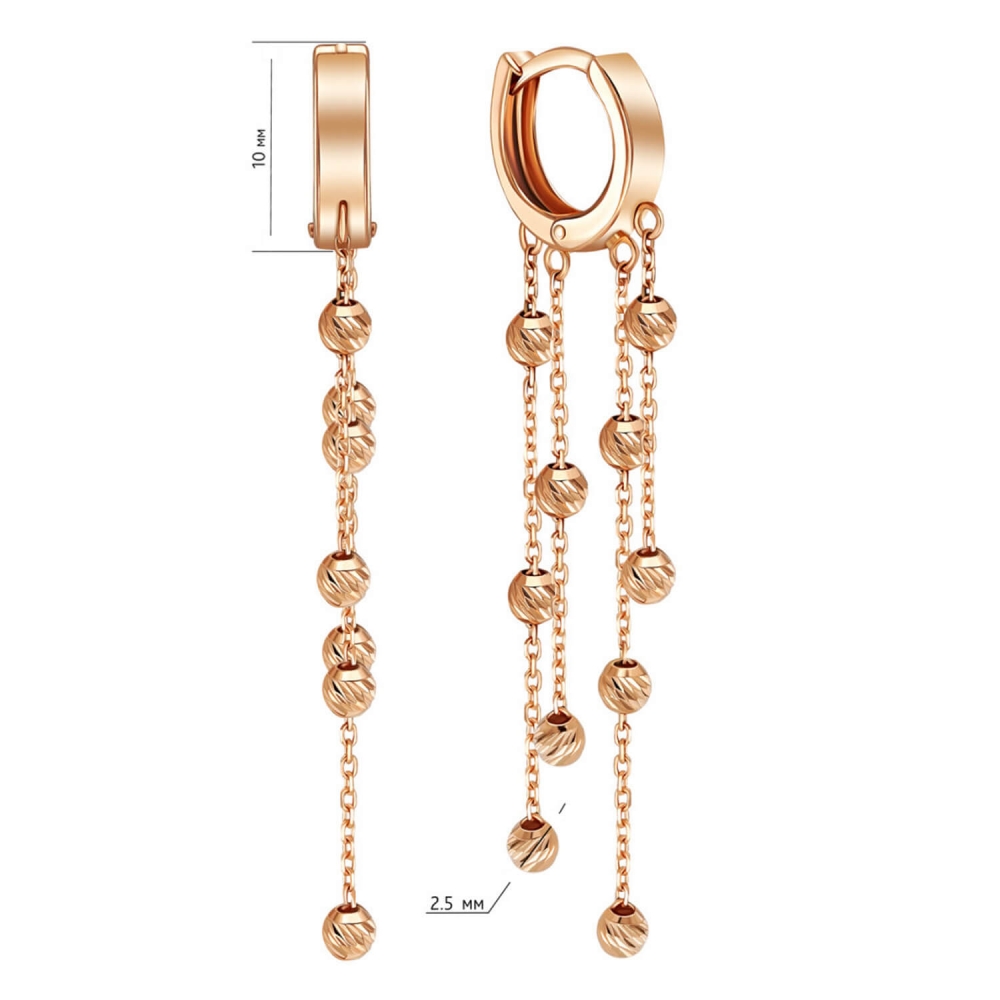 Золоті сережки-кільця з ланцюжками та алмазними кульками.